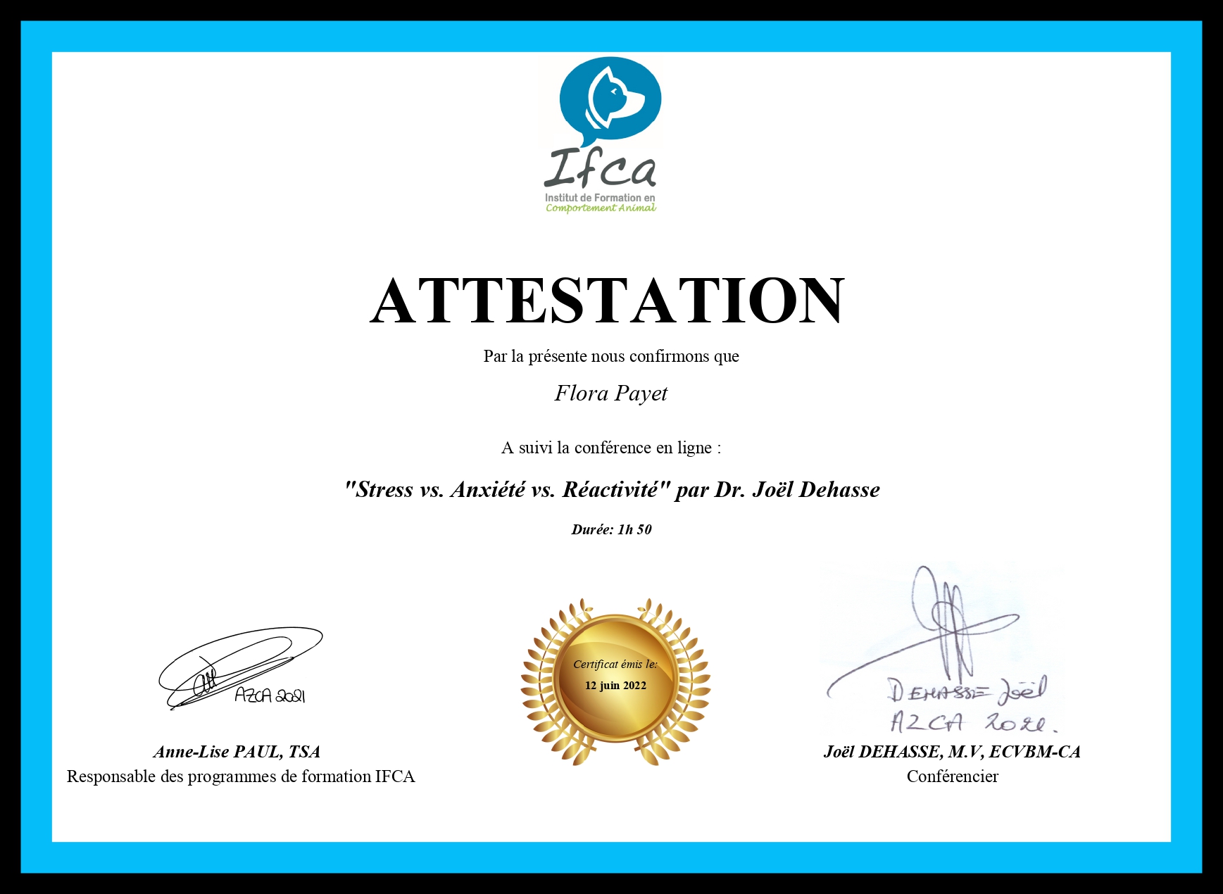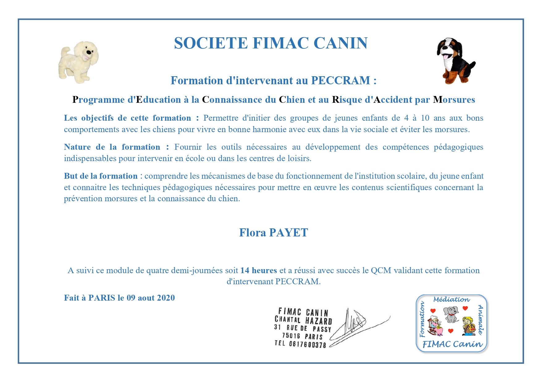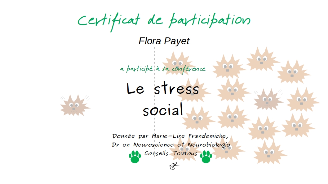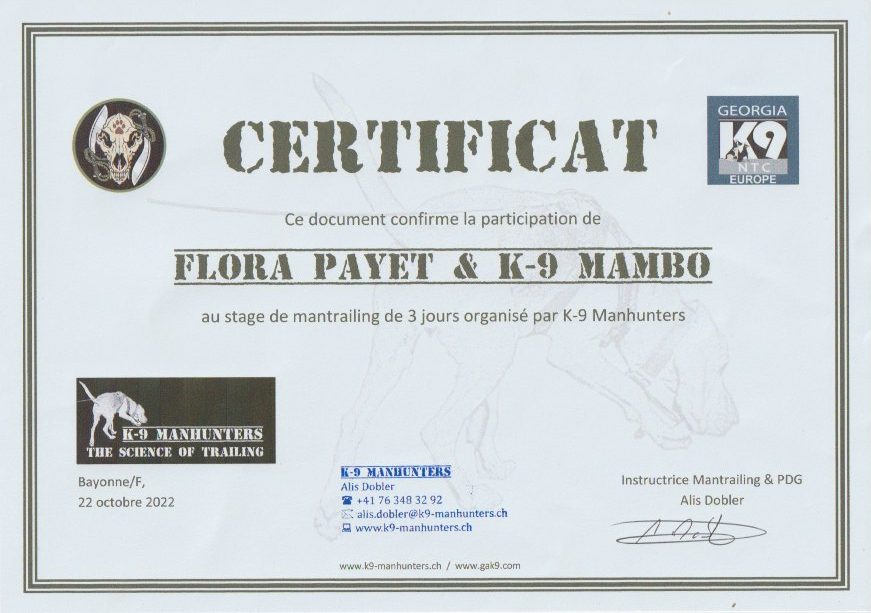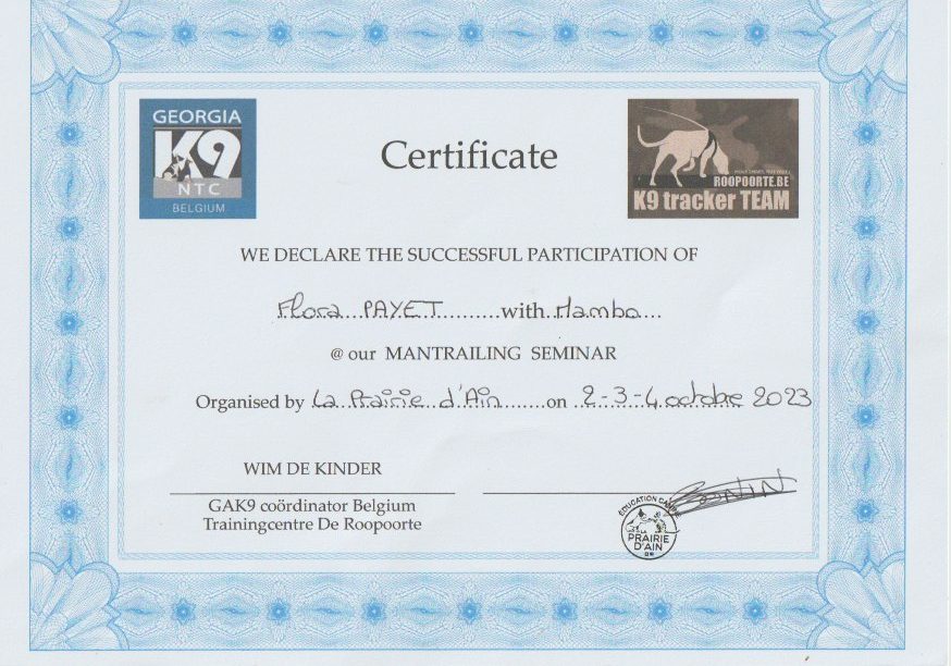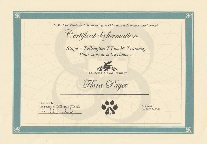 Je me forme régulièrement afin de répondre au mieux aux attentes de chaque binôme humain/chien et de lui proposer l’ accompagnement le plus personnalisé possible.