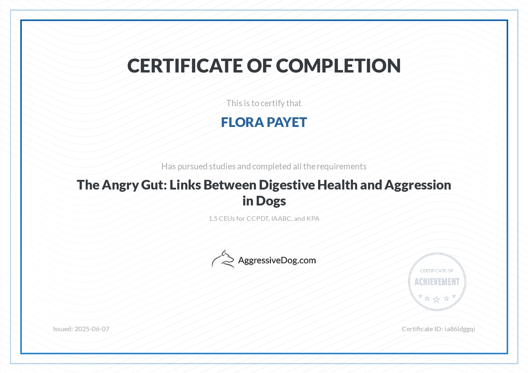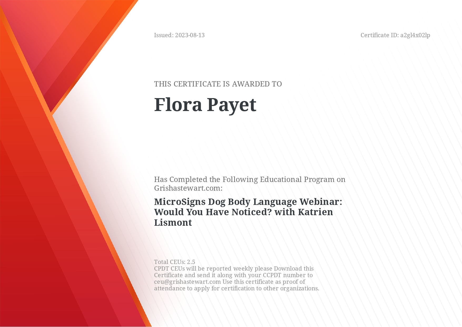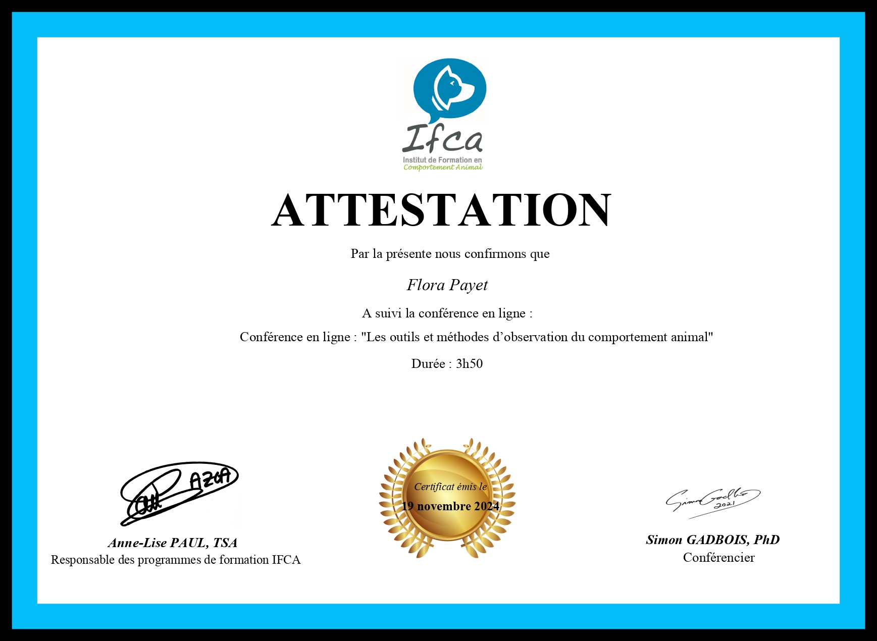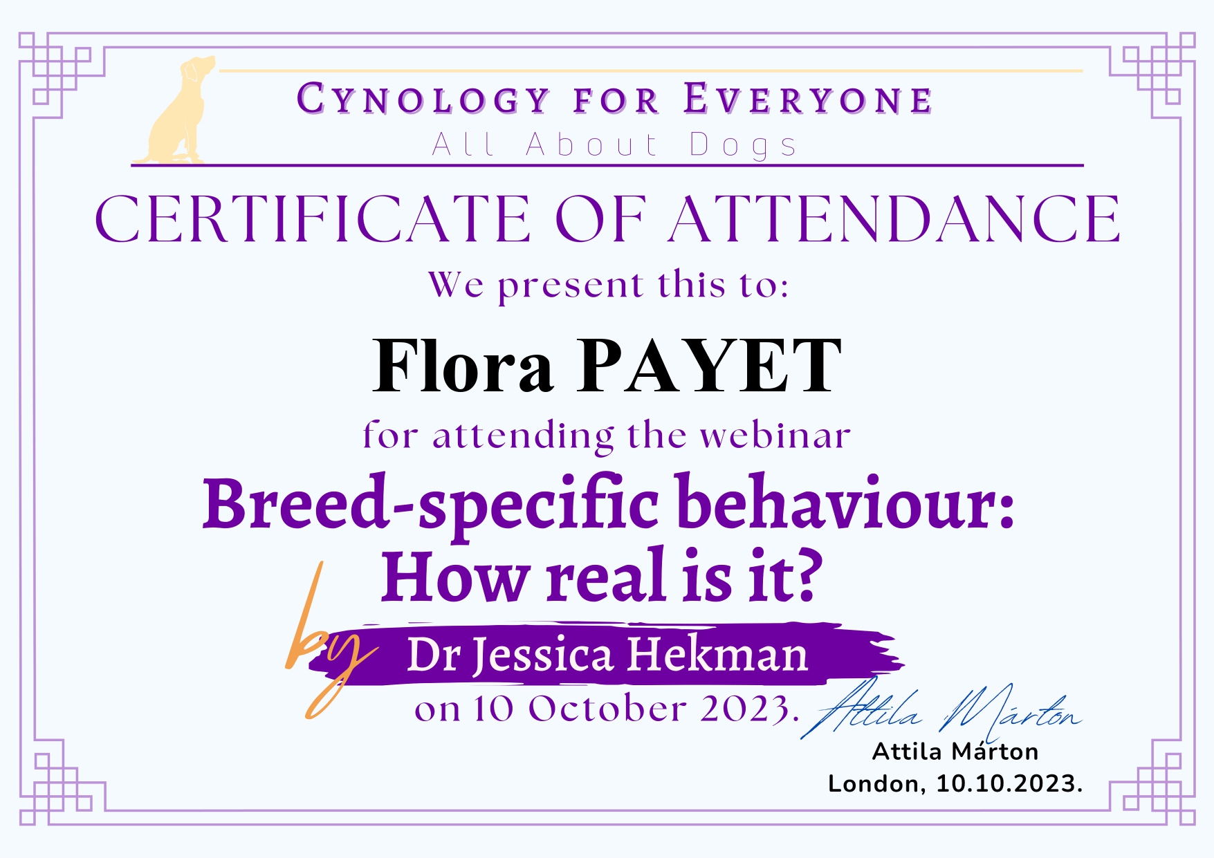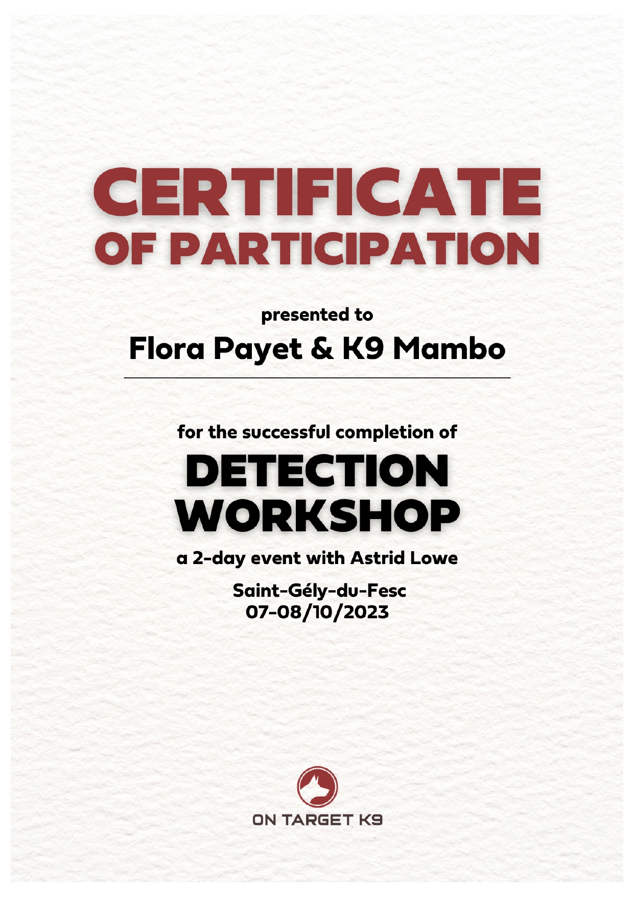 Je me forme régulièrement afin de répondre au mieux aux attentes de chaque binôme humain/chien et de lui proposer l’ accompagnement le plus personnalisé possible.
